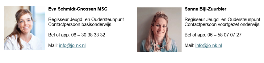 Amber van Veen, Henriëtte Kunis en Fania Konijn zijn gedragswetenschappers JGGZ VO bij Stichting Groeimee. Vanuit JOS is Amber betrokken bij het CSG Jan Arentsz en PCC Oosterhout in Alkmaar, Henriëtte bij praktijkschool Focus in Heerhugowaard, vso De Spinaker Alkmaar en het Stedelijk Dalton College Alkmaar en Fania bij het Jac. P. Thijsse College, het Bonhoeffercollege en Vonk vmbo in Castricum.